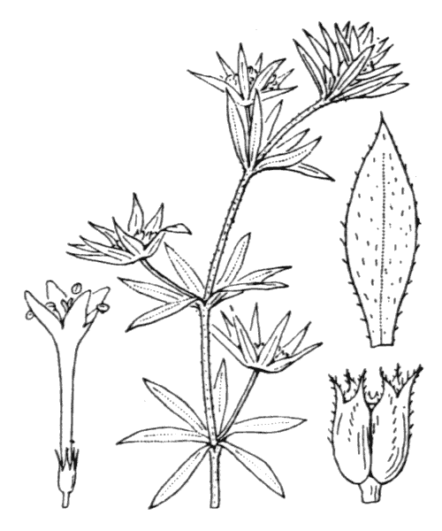 Haut. 5-20 cm. Plante hispide. Tige quadrangulaire, étalée-rameuse. Feuilles inf. verticillées par 4, ovales, les sup. par 6, longues d'env. 1 cm, lancéolées, scabres au bord, mucronées. Fleurs en tête terminale pauciflore, entourée et dépassée par une collerette de 8-10 bractées lancéolées. Corolle rose lilas, à tube long de 3-4 mm et 4 lobes pointus, étalés. Fruit sec, hispide, haut de 3-5 mm, formé de 2 carpelles soudés, surmonté chacun de 3 dents calicinales persistantes.