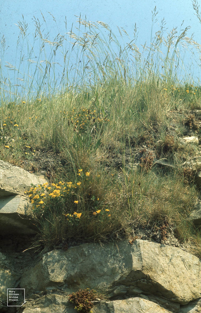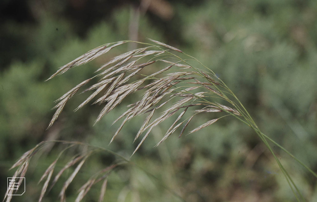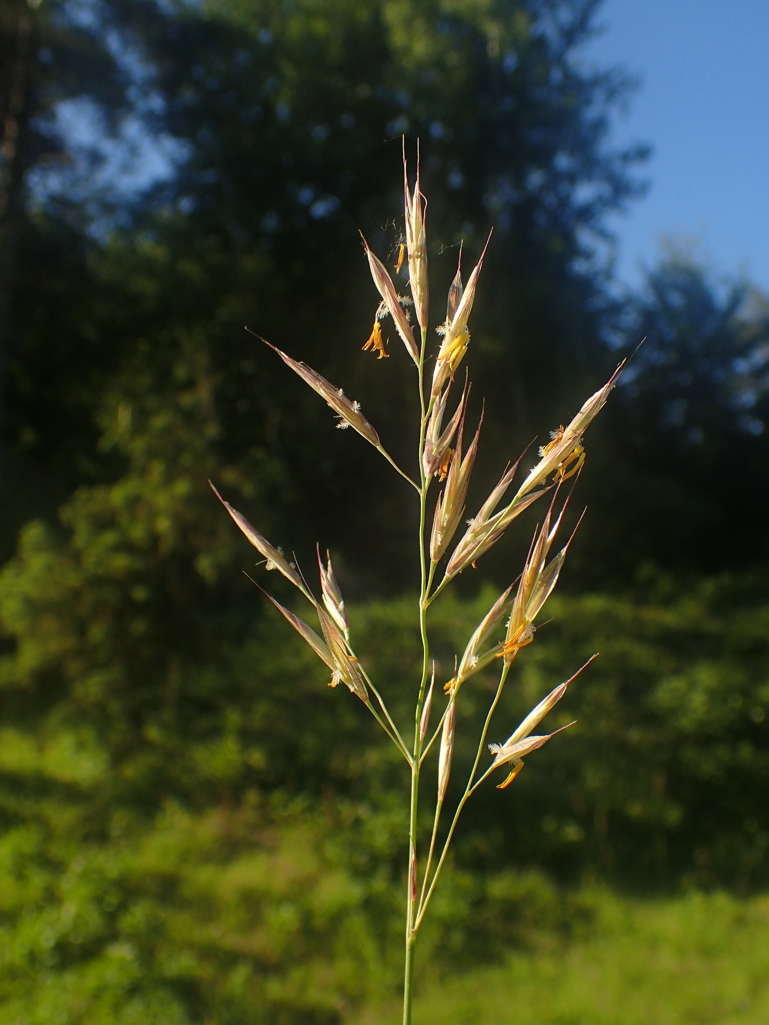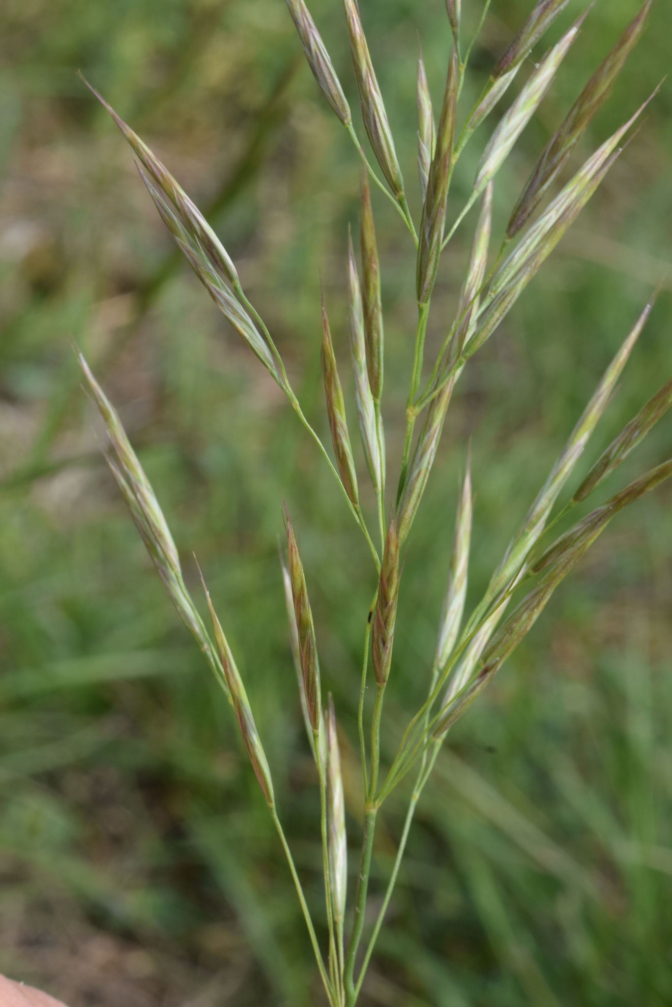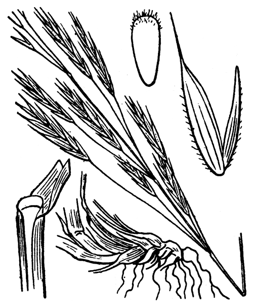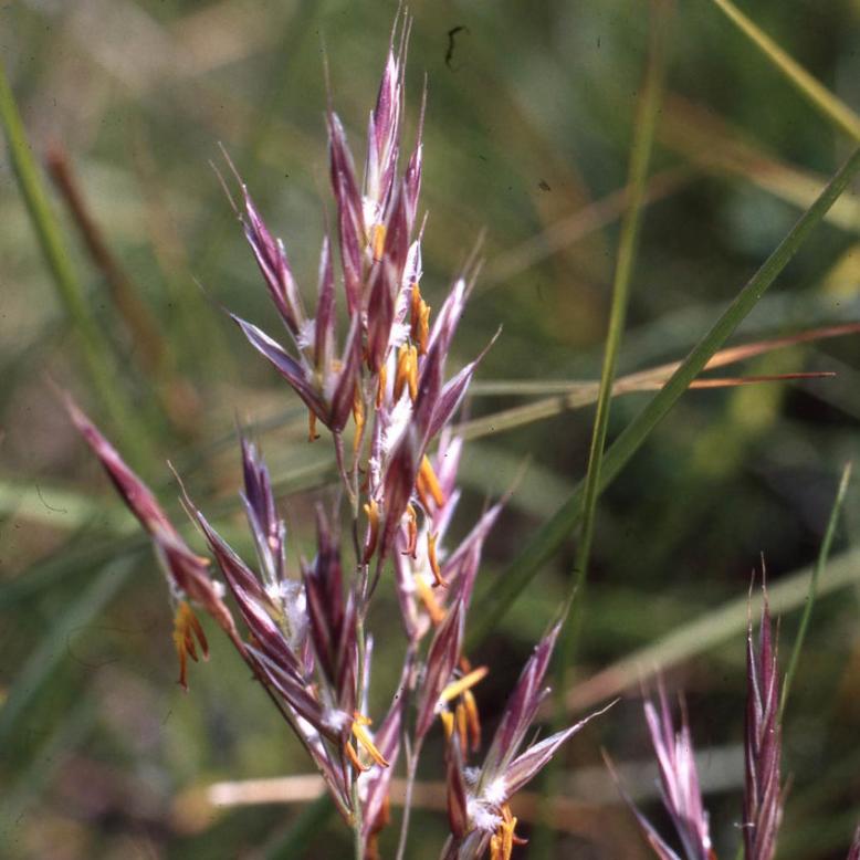4188 Bromus erectus Huds. - Plante vivace de 50 cm à 1 mètre, pubescente dans le bas, à souche fibreuse ou un peu rampante - tiges raides - feuilles d'un vert clair, les radicales étroites, pliées-carénées, pubescentes-ciliées, les caulinaires plus larges (2-4 mm), rudes - ligule courte, tronquée - panicule verte ou violacée, oblongue, raide, dressée, à rameaux scabres réunis par 3-6 - épillets de 2-3 cm, lancéolés, dressés, à 5-9 fleurs aristées - glumes inégales, à 1-3 nervures - glumelles peu inégales, l'inférieure lancéolée, carénée, à 5-7 nervures, bidentée, terminée en arête de moitié plus courte qu'elle.