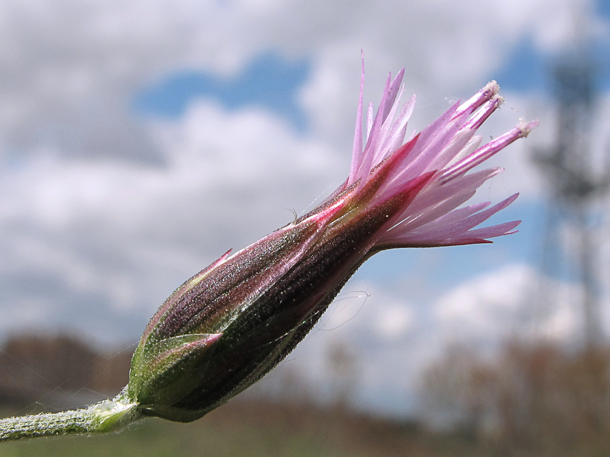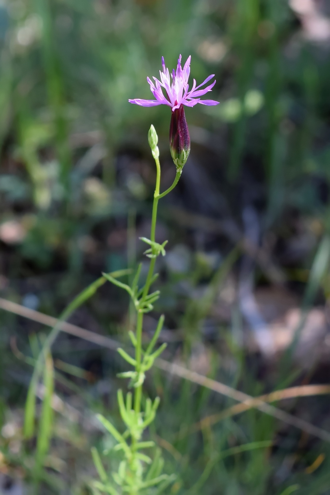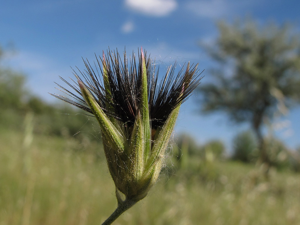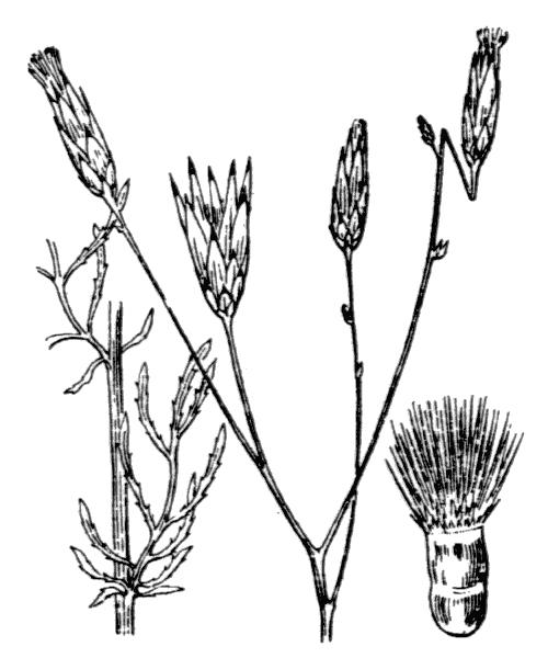 2101 Crupina vulgaris - Plante annuelle de 2-5 dm dressée à rameaux grêles, nus, dressés - feuilles rudes, les radicales indivises, les caulinaires pennatiséquées à segments linéaires denticulés - capitules à 4-5 fleurs - involucre oblong, glabre, atténué à la base - akènes gros, renflés, obconiques, longs de 4 mm 12 environ, plus courts que l'aigrette à soies d'un roux foncé ou d'un brun noir - aigrette intérieure formée de 10 écailles - ombilic basilaire, suborbiculaire - fleurs purpurines.
