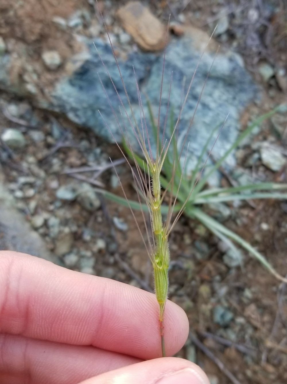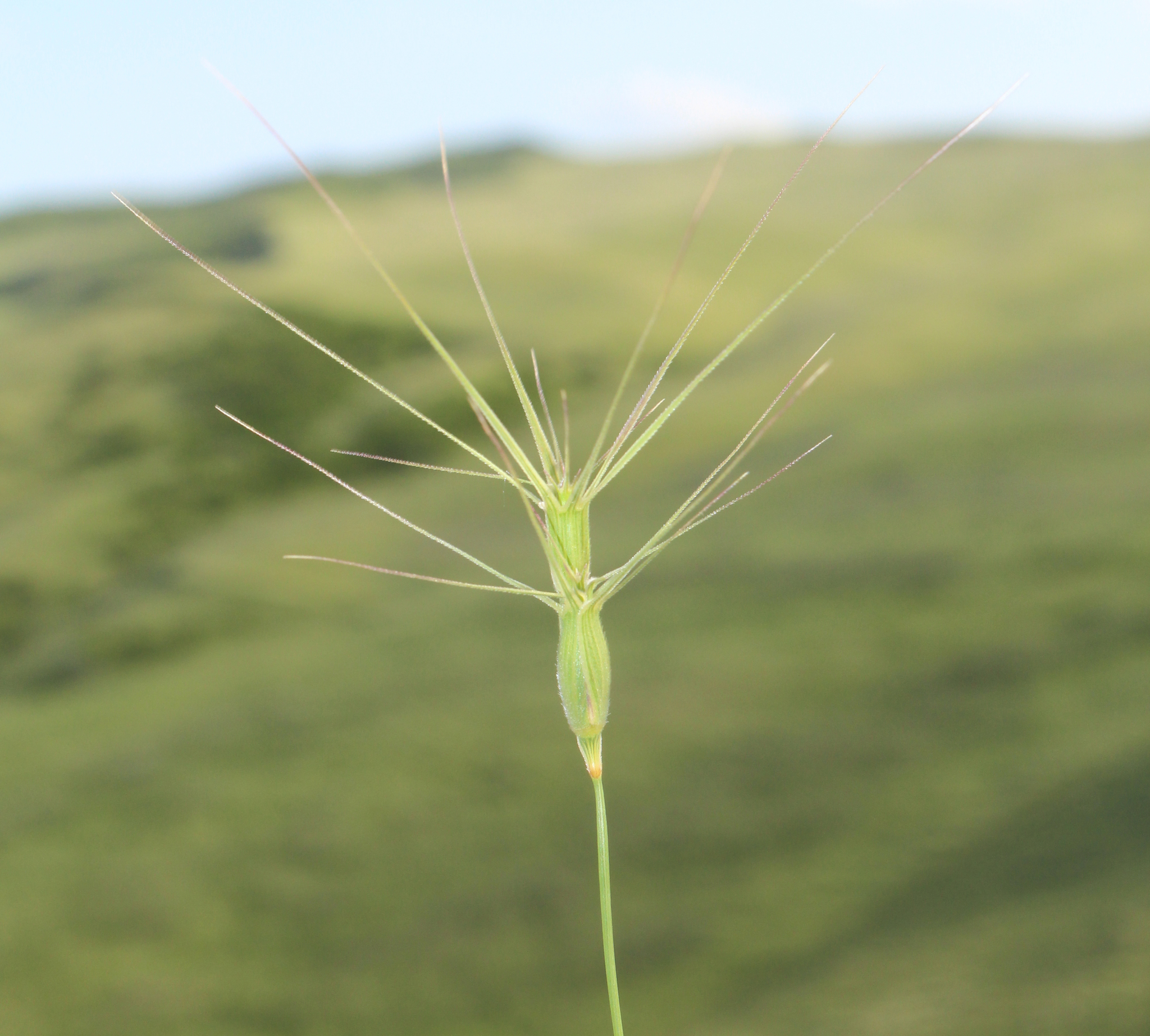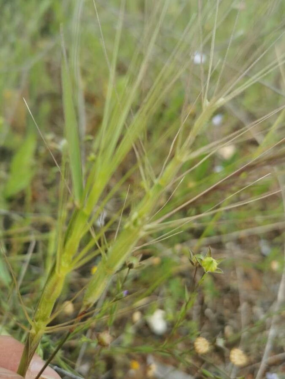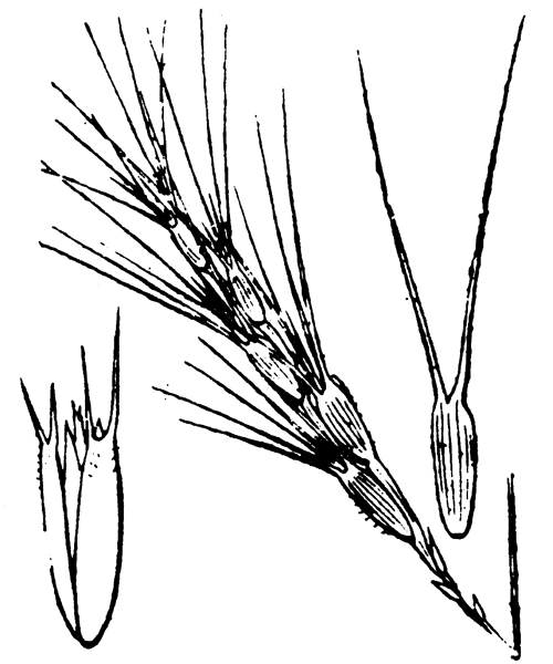 4224 Aegilops triuncialis - Plante annuelle de 20-50 cm, velue, à racine fibreuse - tiges en touffe, ascendantes - feuilles planes, rudes - épi long de 4-6 cm, linéaire-lancéolé, non fragile, vert pâle ou glauque - épillets 4-7, le supérieur stérile, les autres fertiles, oblongs, non imbriqués, à peine renflés - munis chacun de 4-8 arêtes dressées-étalées, plus longues dans le terminal et égalant 5-8 cm, lisses à la base - glumes non ventrues, à 2-3 arêtes - glumelles à 3 dents ou arêtes courtes, la principale très longue dans l'épillet terminal - 2-4 rudiments stériles à la base de l'épi.