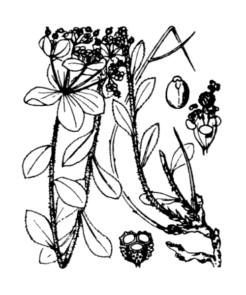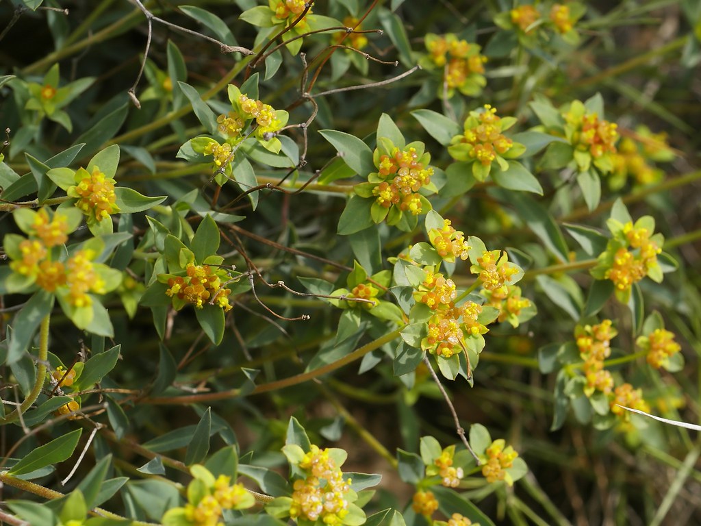 3216 Euphorbia flavicoma DC. - Voisin du précédent. Plante vivace de 10-30 cm, glabre ou pubescente, à souche ligneuse - tiges ligneuses inférieurement, couchées ou redressées - feuilles plus rapprochées, plus petites (1 à 2 cm de long), ovales ou lancéolées, denticulées - ombelle jaune doré, plus petite, à rayons souvent très courts - bractées rhomboïdales - glandes entières - capsule de 3-4 mm, globuleuse, glabre, à peine sillonnée, couverte de petits tubercules hémisphériques peu saillants - graines plus grosses, lisses, caronculées.