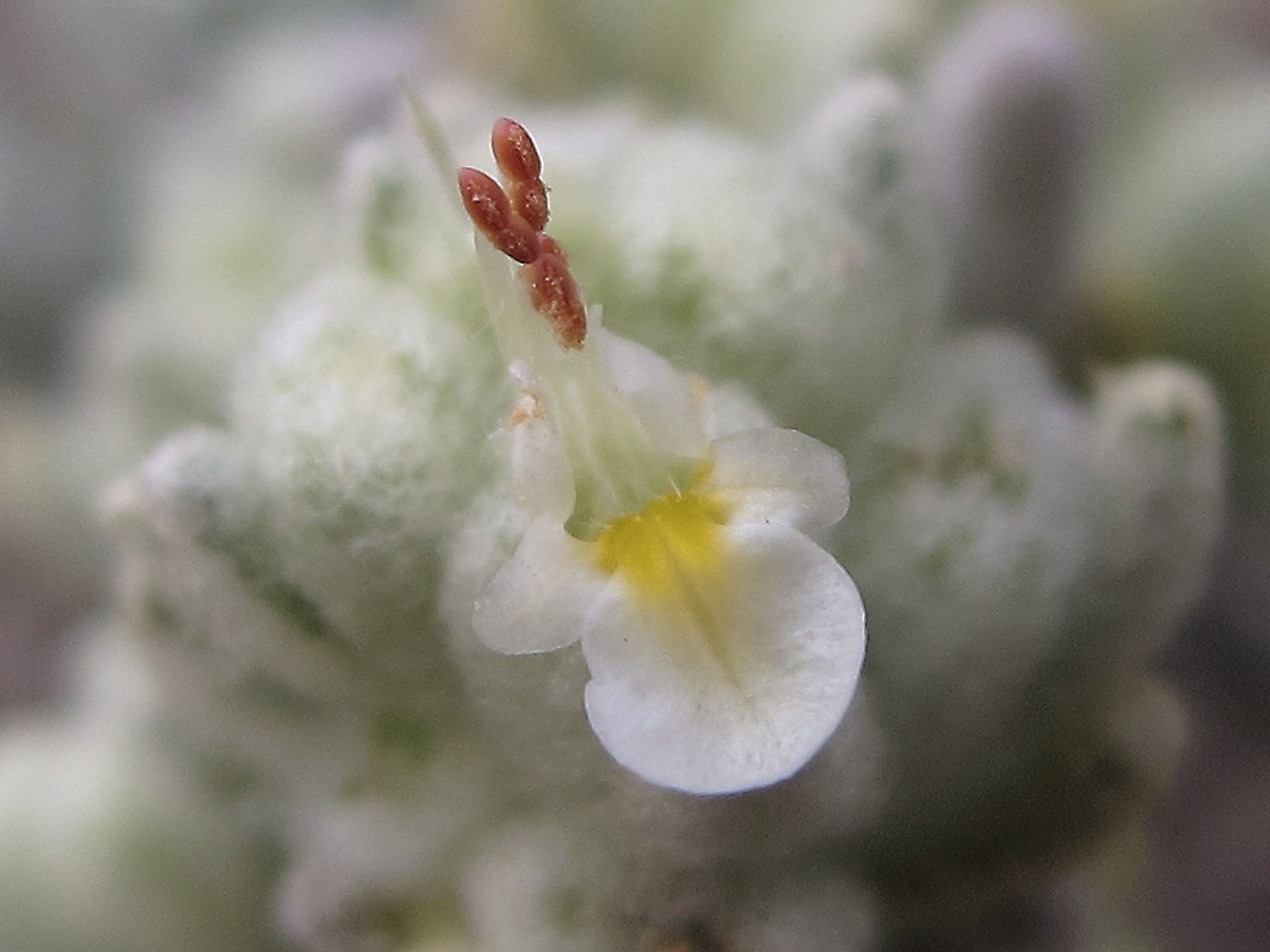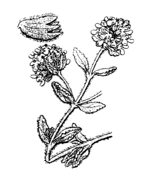 2987 Teucrium polium L. - Plante vivace de 10-30 cm, à tiges ligneuses, ascendantes, blanches-tomenteuses - feuilles sessiles, linéaires-lancéolées ou oblongues, en coin et entières à la base, crénelées dans le haut, enroulées aux bords, blanches-tomenteuses sur les 2 faces, les supérieures écartées des fleurs dans les capitules latéraux - fleurs blanches, rarement purpurines, en têtes blanches, assez grandes, globuleuses ou ovoïdes, agglomérées ou en panicule, serrées, brièvement tomenteuses - calice brièvement tomenteux, à dents courtes, non carénées, subaiguës, la supérieure obtuse - corolle à lobes supérieurs pubescents.