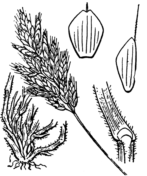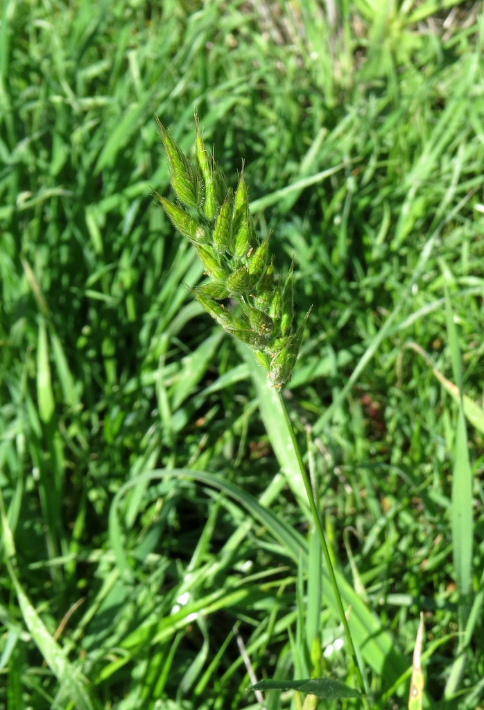 Période de floraisonAvril - JuilletInflorescencePanicule d'épilletsType de fruitCaryopseCouleur de la fleurVertType de sexualitéHermaphroditePollinisationAnémogameDisséminationÉpizoochoreSource : Julve, Ph., 2021 ff. - Baseflor. Index botanique, écologique et chorologique de la flore de France. Version : 27 avril 2021Haut. 20-70 cm. Tiges mollement velues, vert grisâtre. Feuilles atteignant 5 mm de large. Ligule longue d'env. 2 mm, faiblement laciniée. Panicule atteignant 12 cm de long, multilatérale, raide, dressée, contractée. Longs rameaux à 2 épillets ou plus. Epillets longs de 1-2,5 cm, arêtes non comprises, gén. nettement plus longs que les rameaux. Glume inf. à 3 nervures, glume sup. à 5-7 nervures. Glumelle ext. longue de 7-12 mm, à 7 ou 9 nervures saillantes. Arête égalant la glumelle ext. ou plus courte qu'elle.Source : Flora Helvetica 2018Répartition