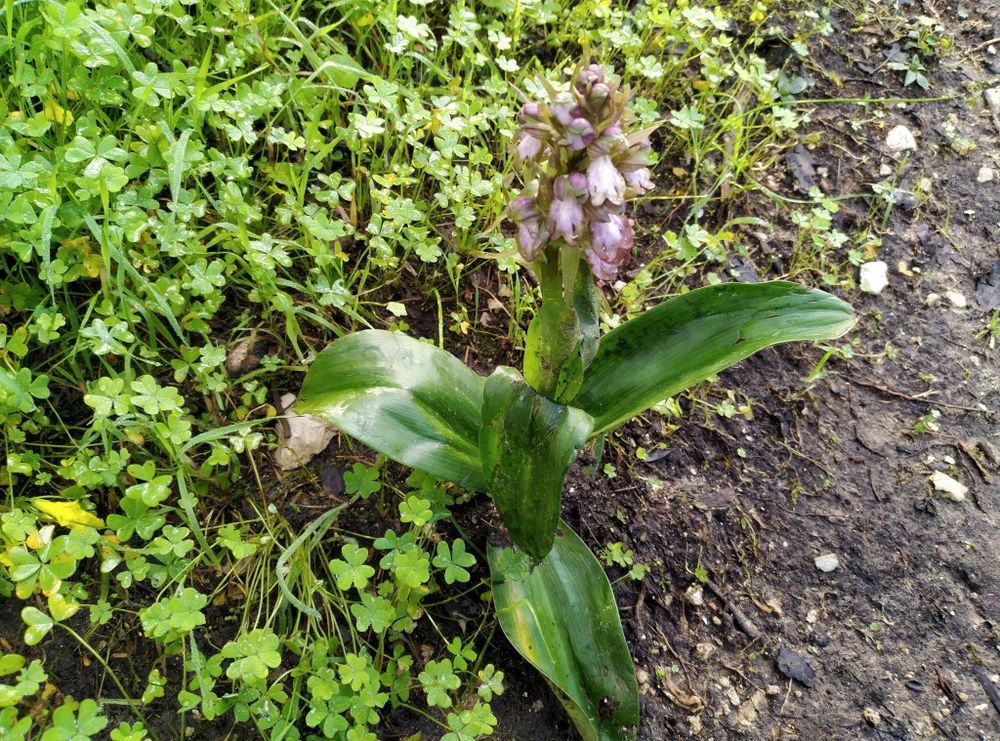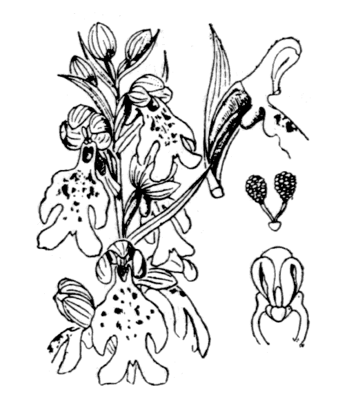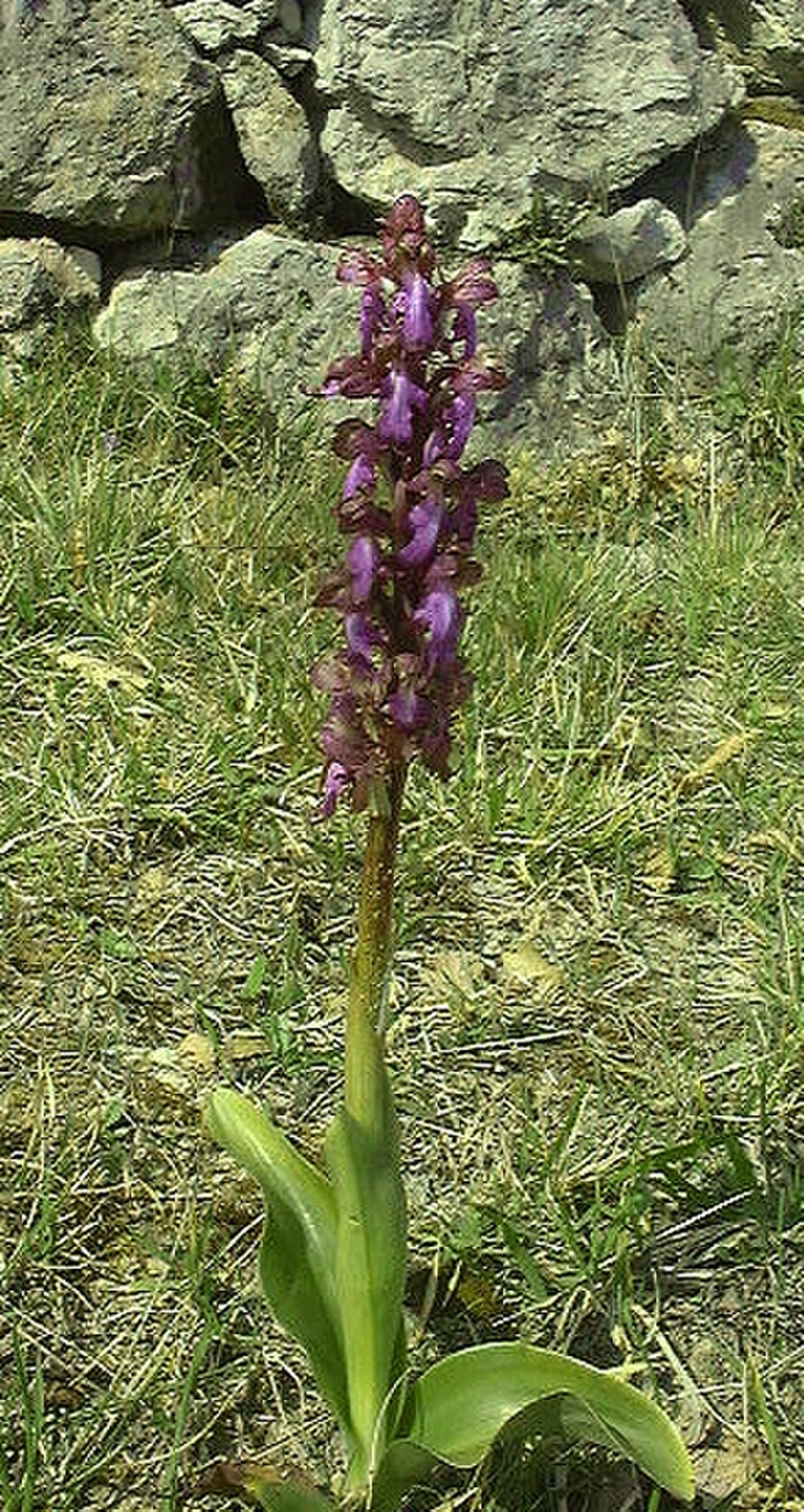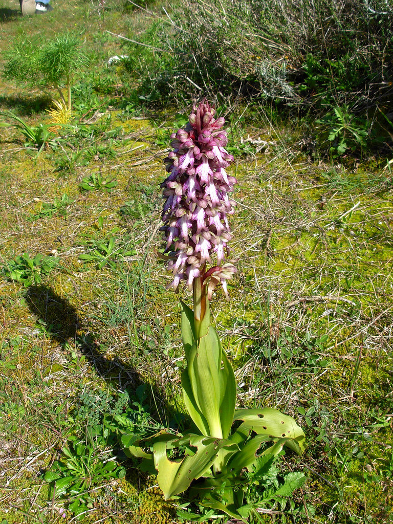 Période de floraisonJanvier - AvrilInflorescenceÉpi simpleType de fruitCapsuleCouleur de la fleurRoseType de sexualitéHermaphroditePollinisationEntomogameDisséminationAnémochoreSource : Julve, Ph., 2021 ff. - Baseflor. Index botanique, écologique et chorologique de la flore de France. Version : 27 avril 2021Haut. 25-80 cm, tige robuste. Feuilles pouvant atteindre 25 cm, ovoïdes à elliptiques, luisantes, groupées à la base de la tige, les sup. embrassant la tige. Inflorescence multiflore, 8-25 cm de long. Bractées deux fois plus longues que les ovaires. Fleurs violet-rose à verdâtres, tachées de pourpre, à odeur d'iris. Cinq tépales connivents en casque. Lèvre trilobée de 13-20 mm de long, à bord ondulé. Éperon conique de 3-6 mm.Source : Flora Helvetica 2018Répartition