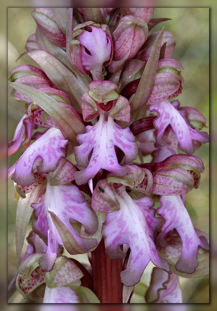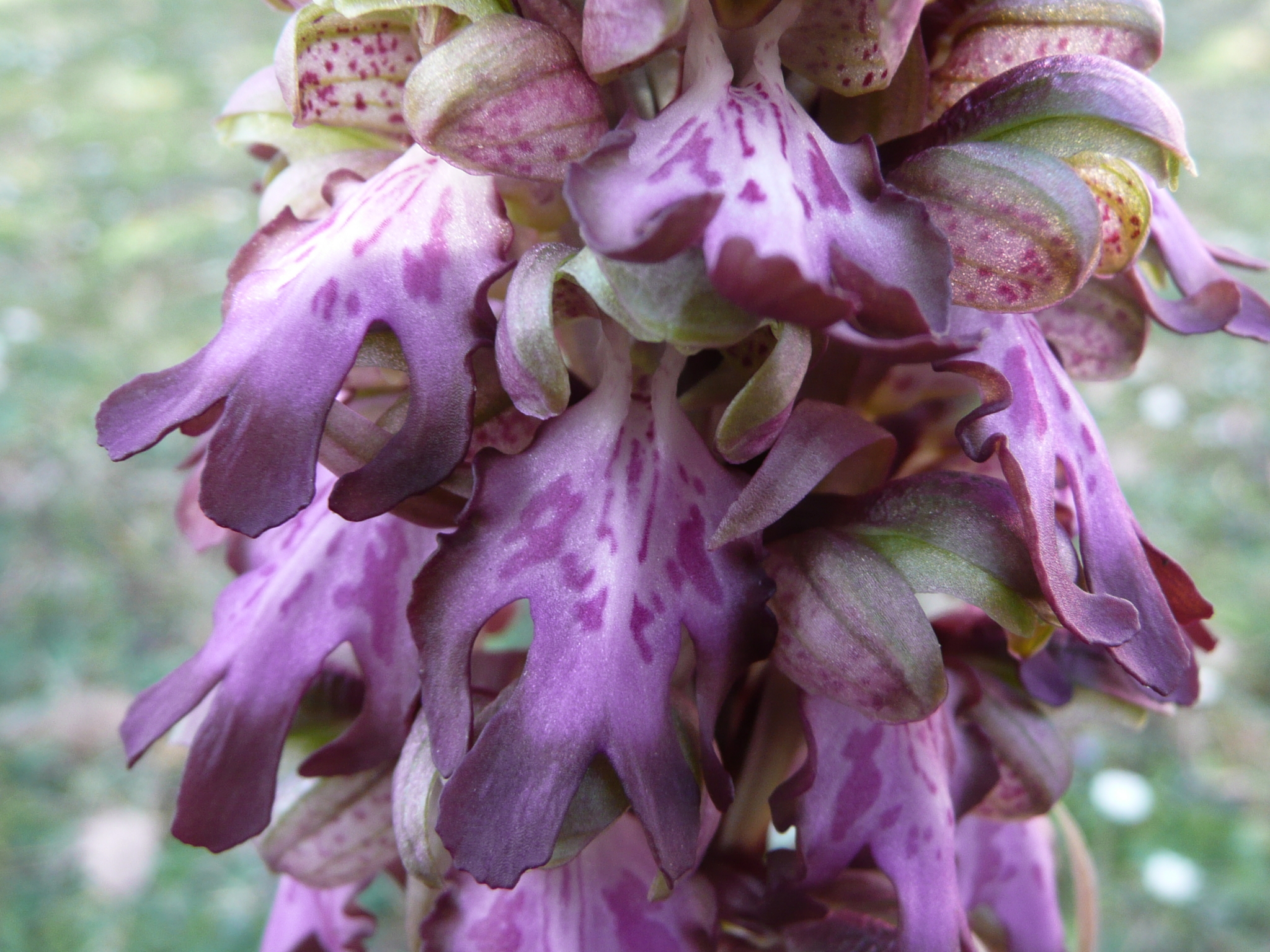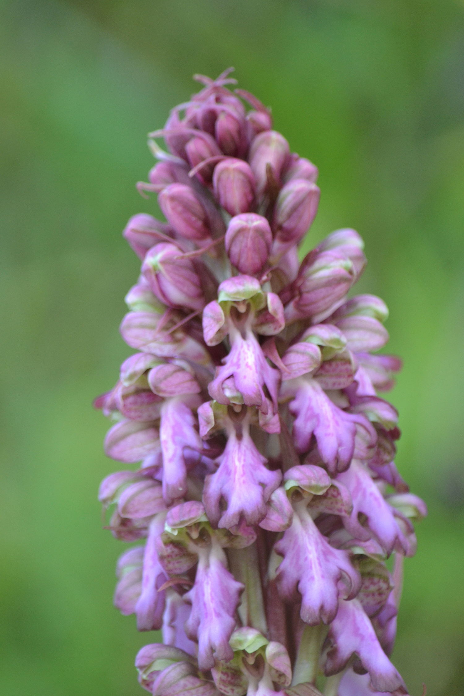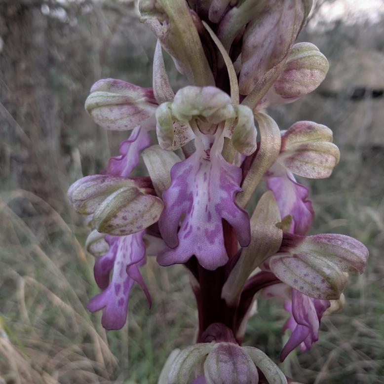 3583 Orchis longibracteata - Plante vivace de 20-50 cm, glabre, robuste, à gros tubercules ovales - feuilles ovales ou oblongues, vertes - fleurs rose pourpre verdâtre, grandes, à odeur d'Iris, en épi ample, ovale-oblong, serré - bractées lancéolées, dépassant les fleurs - divisions du périanthe en casque, les 2 latérales extérieures un peu ouvertes et étalées, ovales-obtuses - labelle 2 fois plus long que les divisions, à 3 lobes plans, les latéraux lancéolés en faux, le moyen plus long, en coeur renversé, à 2 lobes divariqués - éperon gros, 4-5 fois plus court que l'ovaire - rétinacles soudés, bursicule à 1 loge.