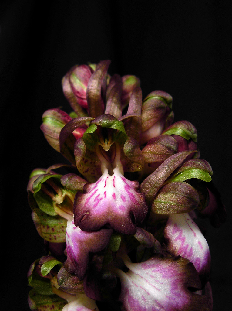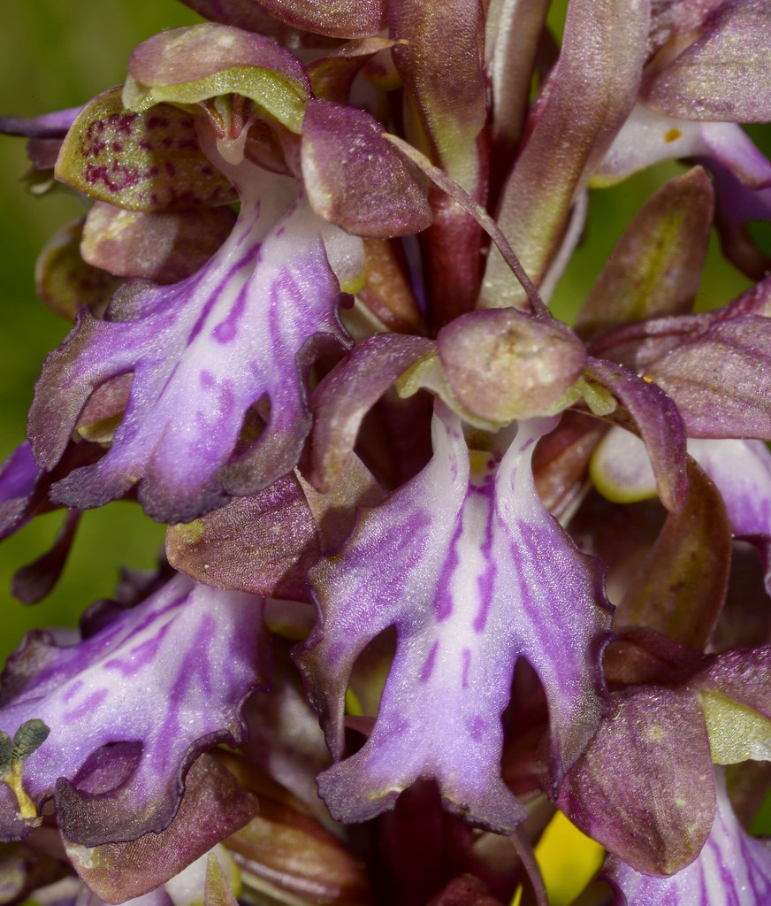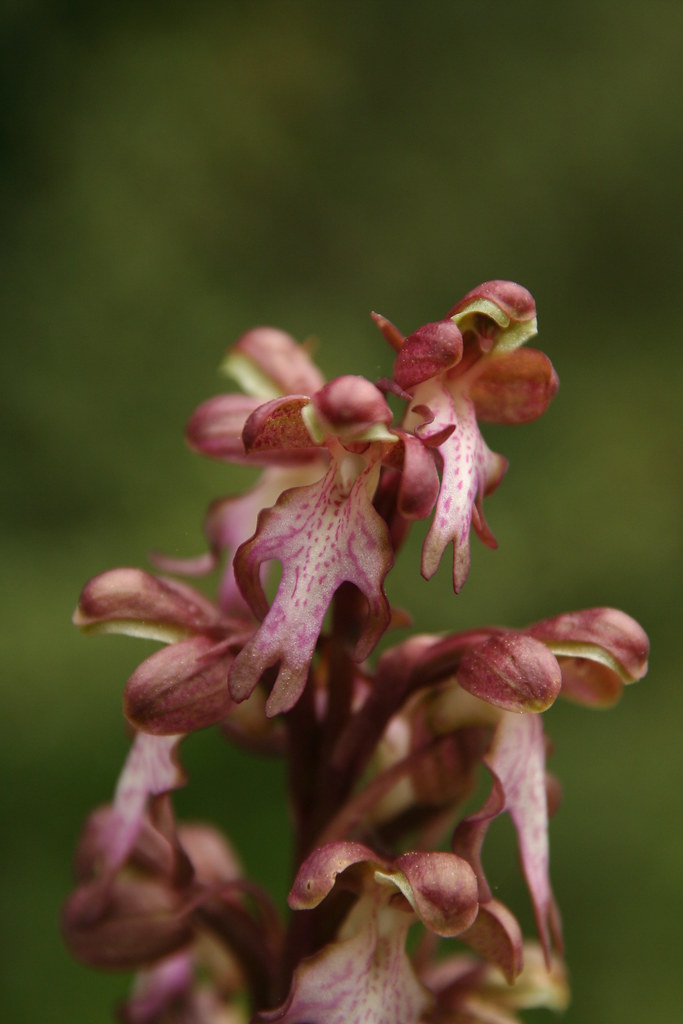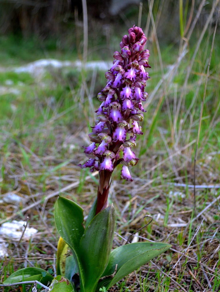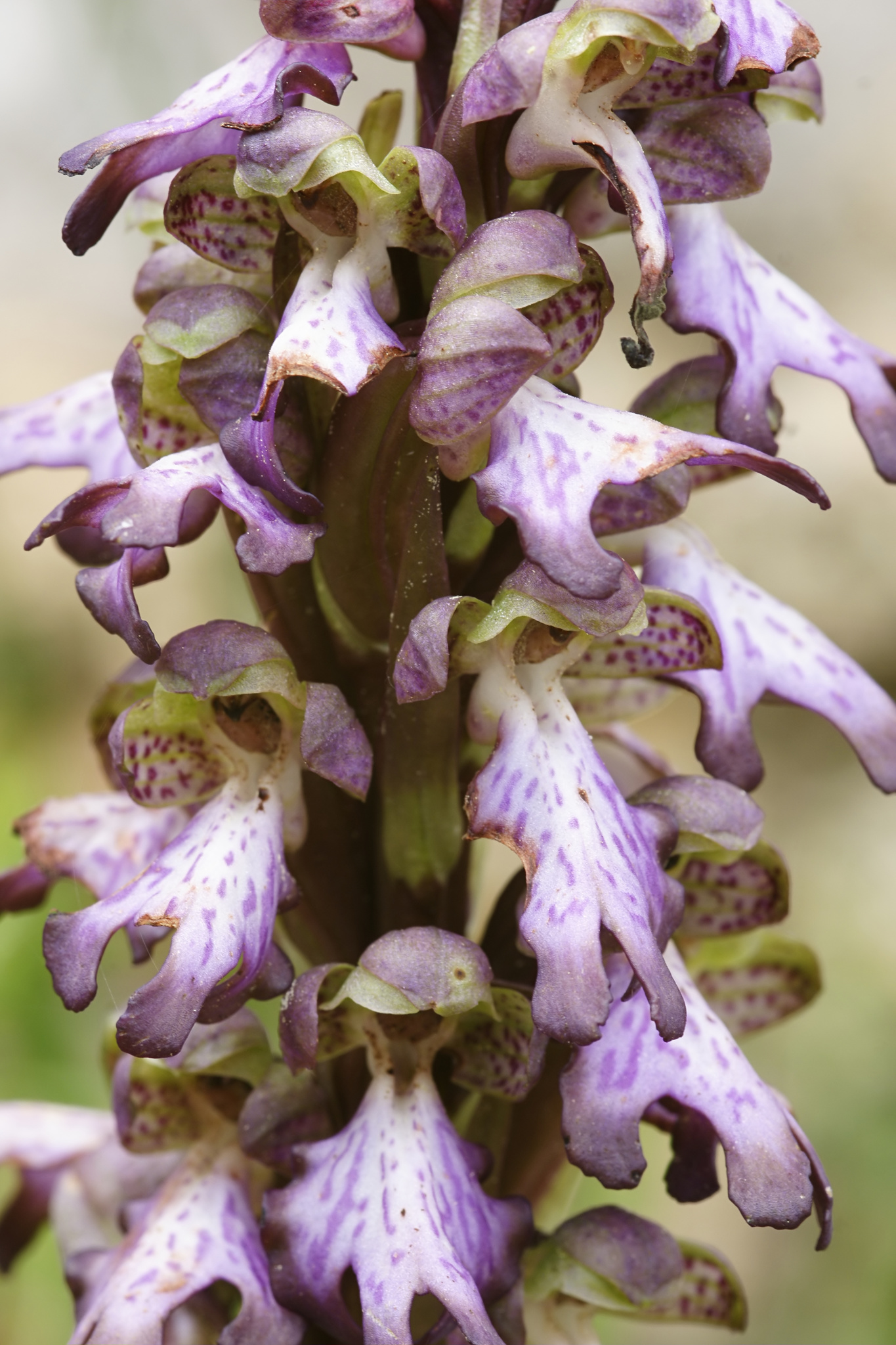3583 Orchis longibracteata - Plante vivace de 20-50 cm, glabre, robuste, à gros tubercules ovales - feuilles ovales ou oblongues, vertes - fleurs rose pourpre verdâtre, grandes, à odeur d'Iris, en épi ample, ovale-oblong, serré - bractées lancéolées, dépassant les fleurs - divisions du périanthe en casque, les 2 latérales extérieures un peu ouvertes et étalées, ovales-obtuses - labelle 2 fois plus long que les divisions, à 3 lobes plans, les latéraux lancéolés en faux, le moyen plus long, en coeur renversé, à 2 lobes divariqués - éperon gros, 4-5 fois plus court que l'ovaire - rétinacles soudés, bursicule à 1 loge.