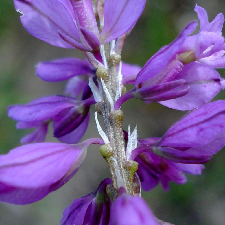 411 Polygala vulgaris L. - Plante vivace, à souche un peu ligneuse - tiges de 10-30 cm, dressées ou ascendantes - feuilles toutes alternes, les inférieures non en rosette, ovales-oblongues, les supérieures plus longues, lancéolées linéaires - fleurs bleues, roses ou blanches, en grappes terminales - bractée moyenne égalant ou dépassant le pédicelle - ailes ovales ou elliptiques, à 3 nervures ramifiées - capsule plus courte et presque aussi large que les ailes. Plante très polymorphe. Varie à épi chevelu, les bractées dépassant le jeune bouton, avec fleurs tantôt grandes en grappes lâches (P. nicaeensis Riss. - P. rosea Desf.), tantôt assez petites en grappes serrées (P. comosa Schk.).